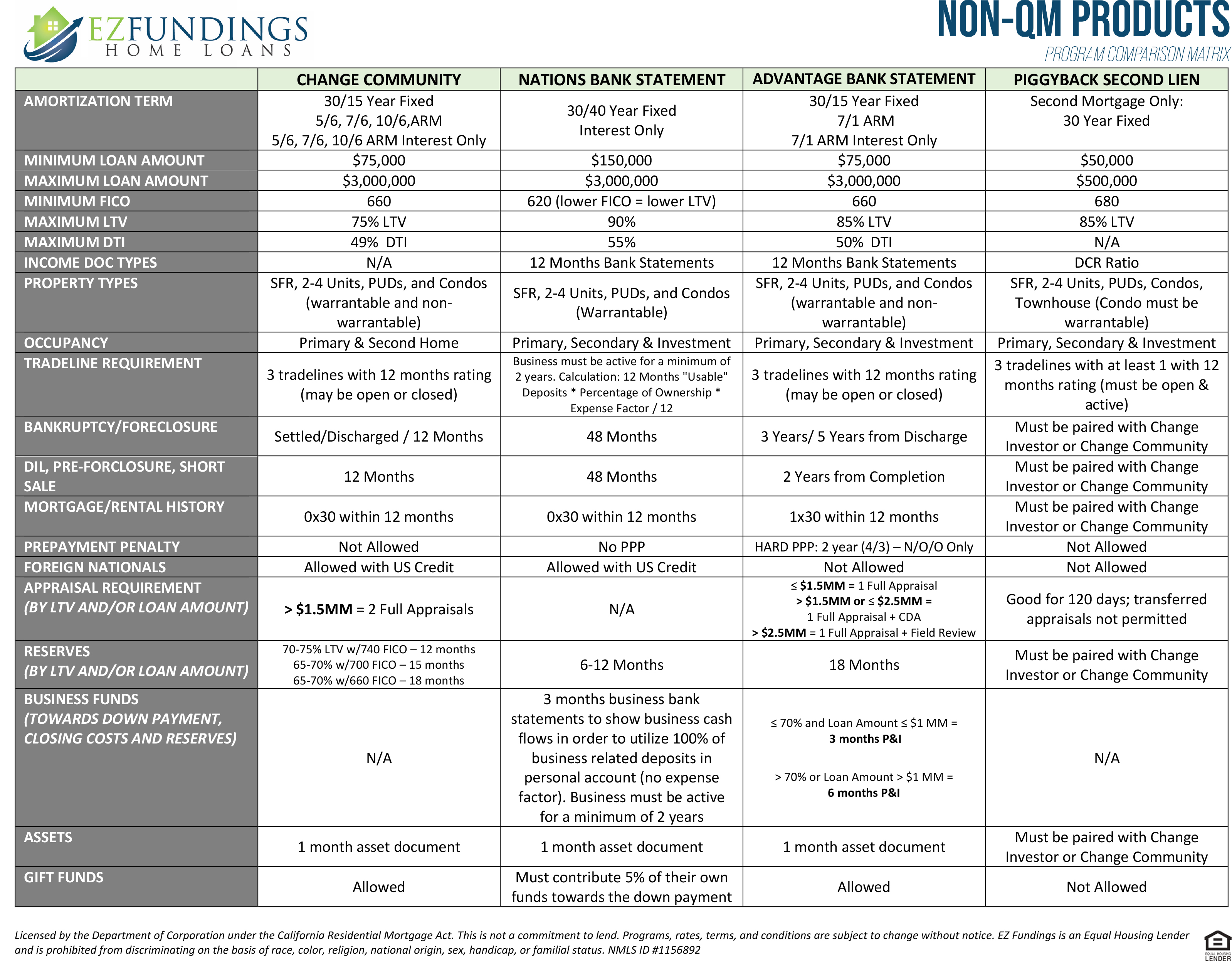 That’s where a Non-QM loan can be helpful. A Non-QM loan can be the solution to help a borrower achieve the American dream of home ownership. Because these are scenarios that do not meet federal standards for qualified or traditional mortgage loans, lenders such as EZ Fundings Home Loan have created special loan products to help more Borrowers achieve their goal of home ownership. A Non-QM loan has different underwriting guidelines than conventional or government-backed loans. Non-QM loan lending guidelines follow regulatory guidelines while considering a borrower’s Ability to Repay (ATR), according to the loan’s terms. This includes cash flow through personal or business bank accounts.